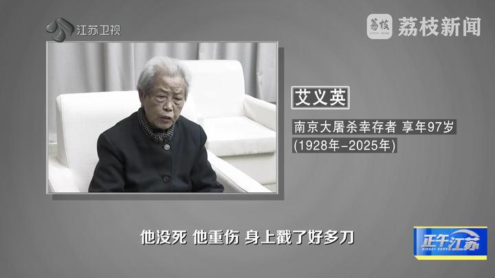 南京大屠杀幸存者艾义英(享年97岁,1928年 -2025年1月9日):“日本人到村里去了。我们待在破房子里,房子被日军冲开了,把我爸爸、叔叔、伯伯、哥哥一起拖走。我拽着我爸爸说‘爸爸你不能走,你不能走。’侵华日军对我很凶,他把我推旁边去。我有一个堂哥他没死,重伤,身上被戳了好多刀。”