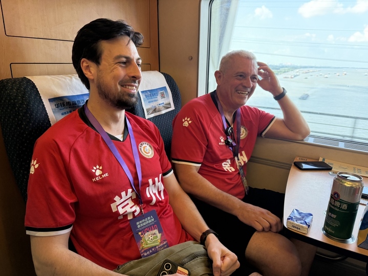 在他看来,苏超的火爆远超预期:“赛场里的欢呼、周边商品的热卖,都在诉说这座城市的经济充满活力。”更让他感动的是细节:“车厢里遇到了巴西老乡,中国同事和我一起喊助威口号……”马西奥笑着告诉记者,这次和家人、同事一起去盐城看球,就是想让远在巴西的朋友知道:“我在常州,过得很好。”