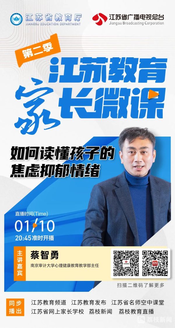 主讲嘉宾,南京审计大学心理健康教育教学部主任蔡智勇将和家长分享支招:可以通过哪些细节,发现孩子的焦虑、抑郁情绪?当孩子深陷焦虑、抑郁情绪时,家长应该怎么办?这四步走,帮助孩子走出困境。