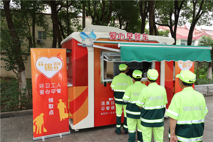 无锡市城管局在太湖大道沿线作业区域内设置了5个就餐点位,由无锡市市民早点餐饮有限公司供餐,满足附近作业一线环卫工人就近就餐需求。“爱心早餐”工程于2023年7月1日起在全市范围内正式实施,为全市11653名一线环卫工人提供早餐。