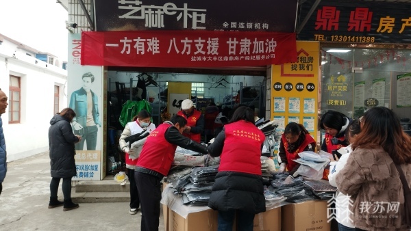 盐城市大丰五金巷一服装小店前,一群红马甲正在忙碌着整理衣服,准备发往甘肃灾区。