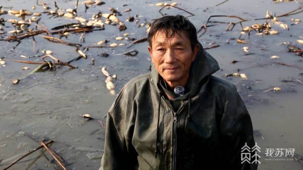 今年60岁的采藕工人陆召之,有着十多年的采藕经验,这段时间每天早上8点就来到藕塘。下水前,要先脱掉身上厚重的棉衣棉裤,换上皮衩进入四五十公分深的藕塘里,寒意瞬间就会从脚底蔓延到全身。
