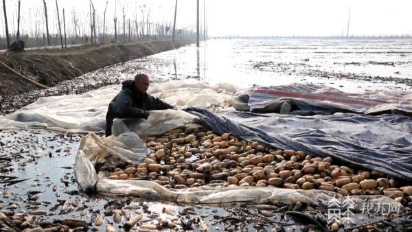 采藕工人陆召之说:“戴一个白的棉手套,太厚皮衩就装不进去了,如果干得快一点,半小时上来一次,如果干得慢一点,十分钟就得上来一次,天气太冷了,吃不消。”