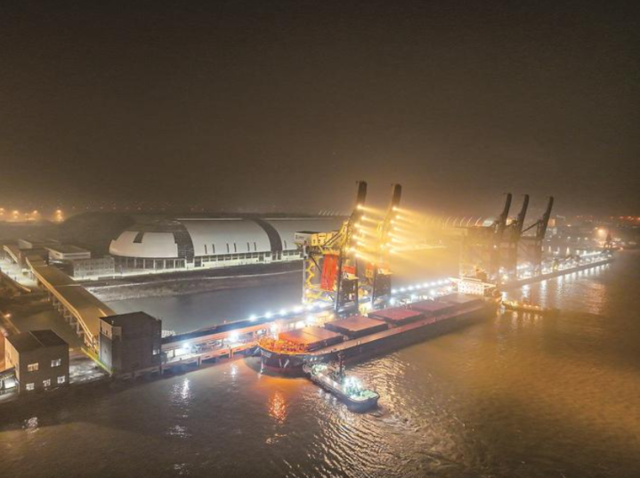 “海轮在港区装卸设备的作用下,实现全自动过驳货物,经由传送带将货物驳载至9艘江轮上。”江苏兴旺物流有限公司副总经理梁涛介绍,通过江海换装,江轮满载后,沿着长江溯流而上,将货物送达上游电厂,为今冬的“迎峰度冬”提供能源保障。