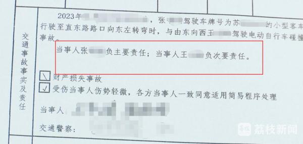 常州市金坛区人民法院交通事故巡回审判法庭法官助理 孟庆波:“张某驾驶小型轿车,沿常州市金坛区某路口左转弯时,与王某驾驶的电动车碰撞,致王某受伤,经交警部门认定,张某负主要责任,王某负次要责任。”
