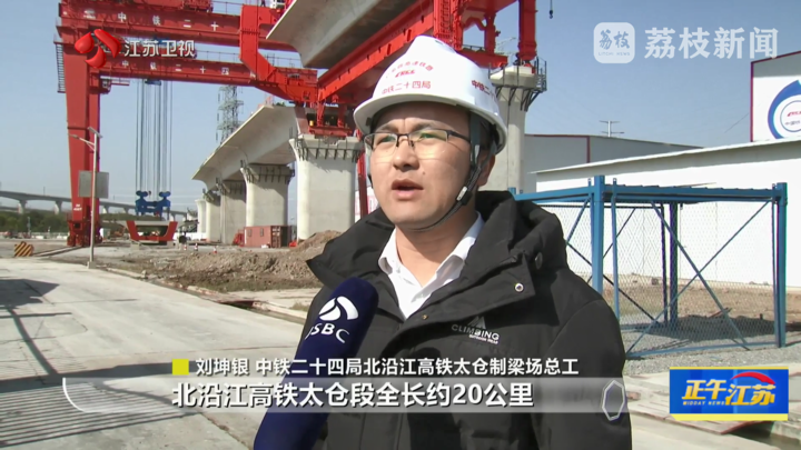 中铁二十四局北沿江高铁太仓制梁场总工刘坤银说:“北沿江高铁太仓段全长约20公里,需要架设502孔双线箱梁、233孔单线箱梁,我们采用国产数字化架梁设备,将以每天3孔箱梁的架设速度从太仓制梁场往上海方向推进,计划年前将完成37孔箱梁的架设任务。”