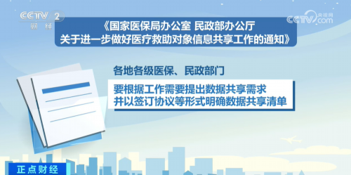 通知要求,各地各级医保、民政部门要根据工作需要提出数据共享需求,并以签订协议等形式明确数据共享清单。原则上,县级民政部门要向同级医保部门提供最低生活保障对象、特困人员、最低生活保障边缘家庭成员和刚性支出困难家庭成员等低收入人口个人信息。地市级医保部门向同级民政部门提供相应困难群众参加基本医疗保险、享受医疗救助和高额医疗费用情况等必要信息。鼓励地市级以上民政部门与医保部门直接共享信息,同步加强救助帮扶信息反馈,实现闭环管理,推动形成“一户(人)一条救助链”。