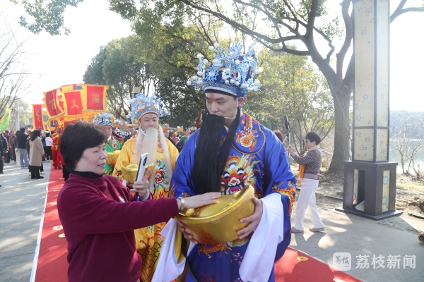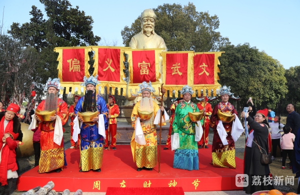 上午09:58分,在挑花篮、打连厢、舞龙舞狮的热闹氛围中,仪式上,家丁们手抬供品和“聚宝盆”,行至财神居,身着古装的周庄庄主,在家丁丫鬟的簇拥下踏上“财道”,上香、敬酒、颂祭文,祈祷来年平安和顺。随后“文、武、富、义、偏”五路财神踏“财道”上前跳财神,为游人送上美好祝福。
