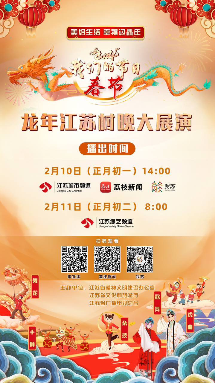 “美好生活 幸福过龘年”——2024“我们的节日·春节”龙年江苏村晚大展演由江苏省精神文明建设办公室、江苏省文化和旅游厅、江苏省广播电视总台共同主办,大年初一2月10日14:00在江苏城市频道、荔枝新闻、我苏客户端同步直播,次日2月11日8:00江苏综艺频道重播。4小时跨越江苏13城,融汇乡村舞台、非遗文化、乡土美食、年货大集等“酒菜”,烹制一桌江苏人的精神“乡宴”。