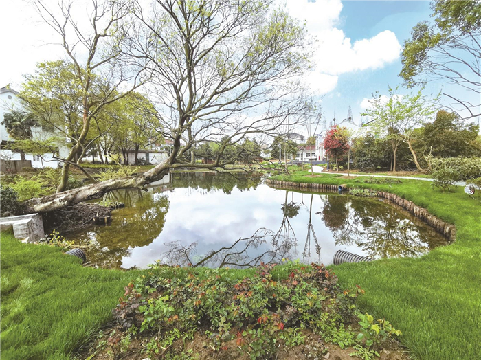 新北区孟河镇南兰陵村委郑塔里村,草地和水塘相依相偎,全村共有大小沟塘12个,自带宁静的古朴滤镜。2021年以来,郑塔里在打造美丽乡村的同时,进行了系统性的小微水体治理。南兰陵村委党总支副书记郑达介绍,近年来,南兰陵村委确定了“塘塘相通、塘渠相连、塘景同治”的治水思路,通过截污纳管、河道清淤、池塘标准化改造、建立长效管护机制,再现秀美水系。