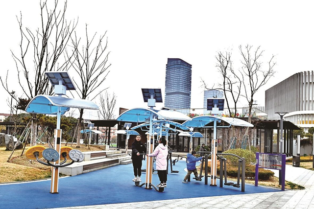 公园处处体现着“共享”理念。公园配套建设的共享操场实行分时分区管理,既兼顾北环小学的运动教学,又满足市民的健身需求,公园南侧还专门设置了非机动车停车场和家长等候区。而公园北侧的景仁书屋与社区园艺中心(课堂)、户外劳动者关爱驿站融为一体,把服务共享效能叠加放大。公园里的智能全民健身器材,现代感十足。北环新村小区居民陈阿妹说:“扫描器械上的二维码下载App,就能在手机上看到自己运动的数据,太好了。”
