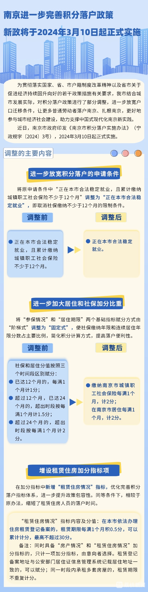 近日,南京市政府印发《南京市积分落户实施办法》(宁政规字〔2024〕3号),2024年3月10日起正式实施。