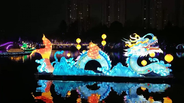 夜幕下的姜堰人民公园,流光溢彩,热闹非凡。小径廊道、亭台楼阁、丛林山水……在“声、光、影”等现代技术的加持下,数万组灯光将园内的一景一物装饰得绚烂夺目。人们或徜徉在廊道下,或打卡在灯组前,或留恋在表演中,尽享假期的快乐时光。水面上,一组名为《神鱼化龙》的灯组特别亮眼。它长15米,宽3米,高5米,像极了一条奔腾翻滚的巨龙。在古代,鱼化为龙寓意金榜题名,象征自强的精神和奋斗的美好。新的一年,不少人借此许下心愿。