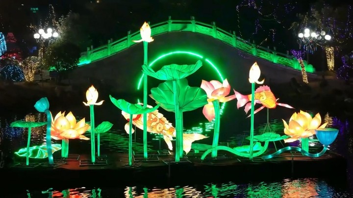 灯火通明,夜色璀璨。象征吉祥如意的祈福天灯,清新脱俗的灯组——《锦鲤戏荷》,深受年轻人喜爱的动漫人物等其它5个大型灯组也吸引不少人驻足留影。同时,现场还有传承千年的打铁花,趣味十足的抛绣球,精彩绝伦的烟花秀,嗨翻全场的乐队演出等多个节目,丰富灯会内容,增加与游人的互动。
