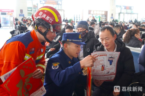 2月9日,记者获悉,近日,无锡市举行“龙耀锡城 文明同行”2024年“情暖回乡路”文明实践志愿服务活动,“蓝锡消防志愿服务队”走进无锡火车站,做好春运期间消防安全宣传工作,提升返乡群众的消防安全意识和自防自救能力,在春运一线为旅客送“安全”。