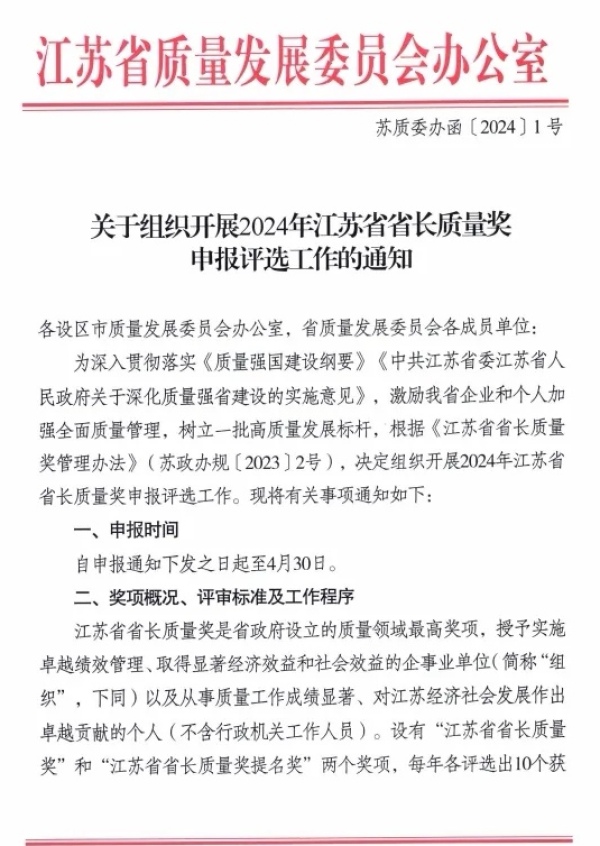 2024年江苏省省长质量奖申报评选工作启动