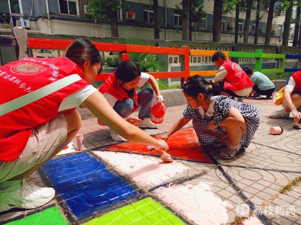 志愿者们与小朋友们共同用颜料装饰社区地面