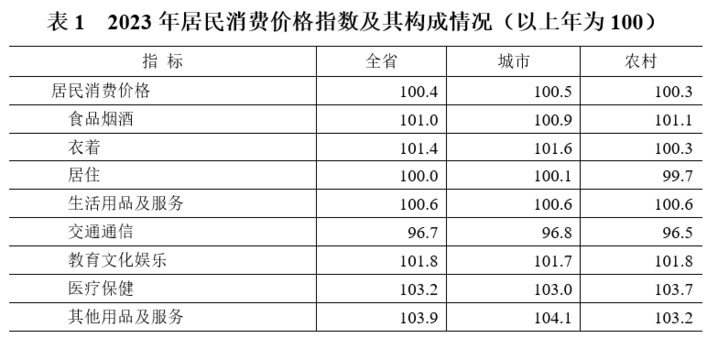居民消费价格小幅上涨。全年居民消费价格比上年上涨0.4%。分城乡看,城市上涨0.5%,农村上涨0.3%。分类别看,食品烟酒价格上涨1.0%,衣着价格上涨1.4%,生活用品及服务价格上涨0.6%,教育文化娱乐价格上涨1.8%,医疗保健价格上涨3.2%,其他用品及服务价格上涨3.9%,交通通信价格下降3.3%,居住价格与上年持平。食品中,粮食、食用油、鲜奶、鲜果、鲜菌价格分别上涨1.8%、2.1%、1.0%、5.6%、1.6%;猪肉、鸡蛋、鲜菜价格分别下降10.6%、0.1%、0.8%。