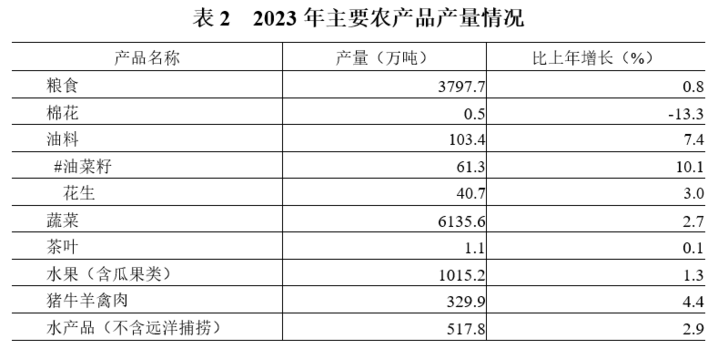 粮食生产再获丰收。全年粮食总产量759.5亿斤,比上年增产0.8%。其中,夏粮产量281.4亿斤,增产0.5%;秋粮产量478.1亿斤,增产0.9%;粮食亩产463.8公斤,增产0.5%;粮食总产、亩产均创历史新高。全年粮食播种面积545.9万公顷,比上年增加1.5万公顷;棉花种植面积0.3万公顷;油料种植面积31.2万公顷;蔬菜种植面积148.4万公顷。