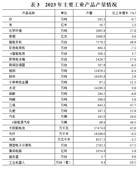 装备制造业增势向好。全年规模以上装备制造业增加值比上年增长7.8%,占规模以上工业增加值比重达53.4%。分行业看,汽车、电气机械、铁路船舶行业增加值分别增长15.9%、15.9%、15.2%。新能源、新一代信息技术相关产品产量增长较快,其中新能源汽车、汽车用锂离子动力电池、太阳能电池、智能手机、服务器产量分别增长46.3%、18.7%、45.6%、48.9%、9.8%。