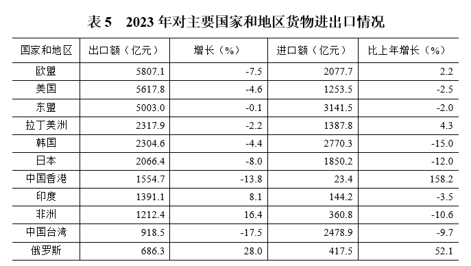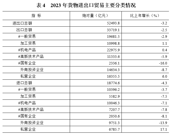 对外贸易稳中提质。全年进出口总额5.2万亿元,同比下降3.2%,占同期全国进出口总额的12.6%。从贸易方式看,一般贸易进出口3万亿元,占比57.3%;加工贸易进出口1.7万亿元,占比31.6%。从经营主体看,民营企业进出口2.4万亿元,规模创历史新高,增长8.5%,占比较上年提升4.9个百分点至45.2%。从主要市场看,对共建“一带一路”国家进出口2.3万亿元,增长0.9%,占比较上年提升1.7个百分点至42.9%;对中东地区、非洲、印度进出口分别增长19.7%、8.9%、6.9%。从出口产品看,手机、船舶、“新三样”产品出口分别增长69.1%、37.1%、12.3%。