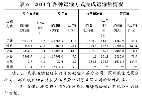 交通运输业恢复常态。全省铁公水空管五种运输方式完成货物运输量比上年增长11.1%,货物周转量增长11.7%;旅客运输量增长54.4%,旅客周转量增长114.3%。全省机场飞机起降52.6万架次,比上年增长65.9%;旅客吞吐量5482.2万人次,增长122.9%;货邮吞吐量63.7万吨,增长7%。全省港口完成货物吞吐量35.1亿吨,比上年增长8.3%;其中外贸货物吞吐量6.2亿吨,增长12.1%;集装箱吞吐量2544.9万TEU,增长6.3%。年末全省公路里程15.9万公里,比上年末增加741公里;其中高速公路里程5128公里。铁路营业里程4623.2公里,其中高速铁路里程2541.4公里。年末民用汽车保有量2456.3万辆,比上年末增长8.4%,净增190.6万辆。其中,私人汽车保有量2103.1万辆,增长6.9%;私人轿车保有量1388.6万辆,增长5.5%。