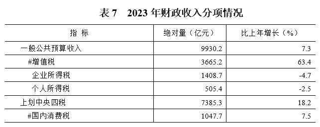 财政收入稳步增长。全年一般公共预算收入9930.2亿元,比上年增长7.3%。其中税收收入7977亿元,增长17.3%;税占比达80.3%,比上年提高6.8个百分点。