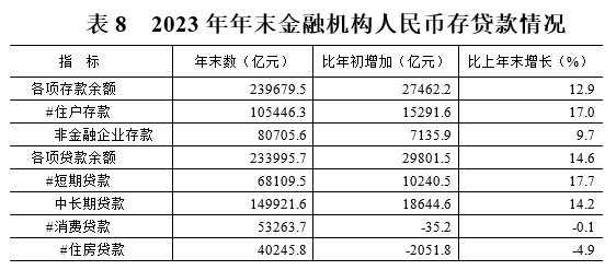 金融存贷款持续快增。年末全省金融机构人民币存款余额239679.5亿元,比上年末增长12.9%,比年初增加27462.2亿元。其中,住户存款增加15291.6亿元,非金融企业存款增加7135.9亿元。年末金融机构人民币贷款余额233995.7亿元,比上年末增长14.6%,比年初增加29801.5亿元。其中,中长期贷款增加18644.6亿元,短期贷款增加10240.5亿元。