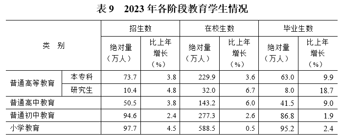 教育事业稳步推进。年末全省共有普通高等学校168所(含独立学院)。普通高等教育本专科招生数73.7万人,在校生数229.9万人,毕业生数63万人;研究生招生数10.4万人,在校生数32万人,毕业生数8万人。中等职业教育(不含技工学校)招生数23.2万人,在校生数67.9万人。特殊教育学校招生数0.4万人,在校生数2.1万人。全省共有幼儿园8073所,在园幼儿209.9万人。