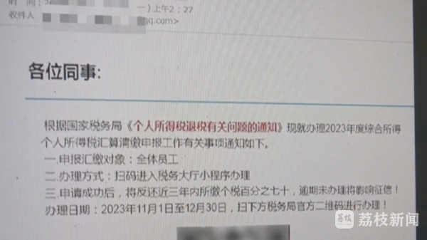 今天,记者获悉,近日,扬州市民吴先生收到一封名为《国家税务总局退税文件》的邮件,声称扫描邮件内的二维码,办理个税退税申报。吴先生没有丝毫怀疑,随即扫描了二维码,根据页面提示输入银行卡、身份证等个人信息,并通过手机短信验证,不料竟收到了境外消费人民币2万多元的短信。