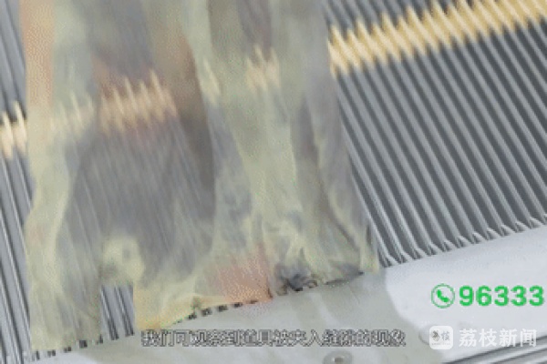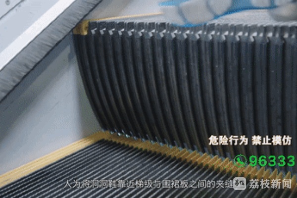 公共场所的自动扶梯为人们的生活带来了便捷,但如果不注意自身安全,扶梯也可能会成为伤害人的“老虎口”。那么,市民在乘坐电梯时应该注意哪些呢?市场监管部门通过实验带您了解,那些乘自动扶梯时的危险动作。看似安全的扶梯进出口却暗藏风险,实验将假手模型、高跟鞋、丝巾等道具放置在扶梯梯级上,道具随着梯级一起运行,当道具到达扶梯出口的梳齿板位置时,可观察到道具被夹入缝隙。