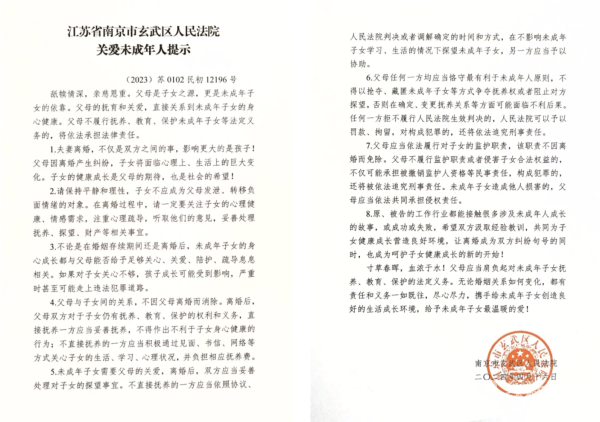 南京玄武法院发出南京首份“关爱未成年人提示”