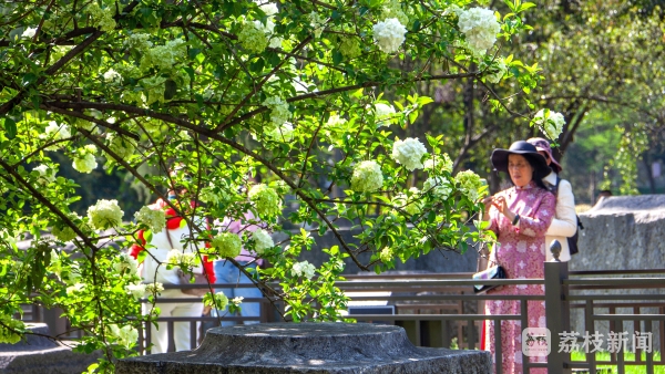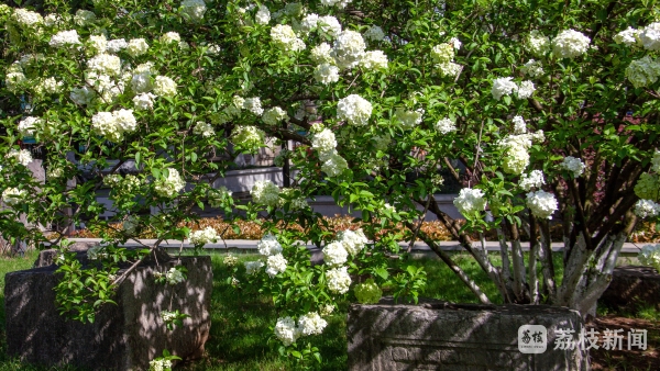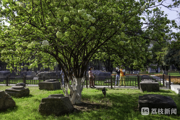 4月5日,南京午朝门公园绣球花美丽绽放,枝头缀满了可爱的白色花球,明故宫古构件静静躺在一簇簇绣球花下,似乎在诉说着昔日的故事。