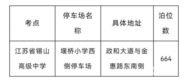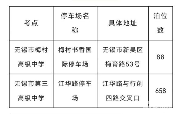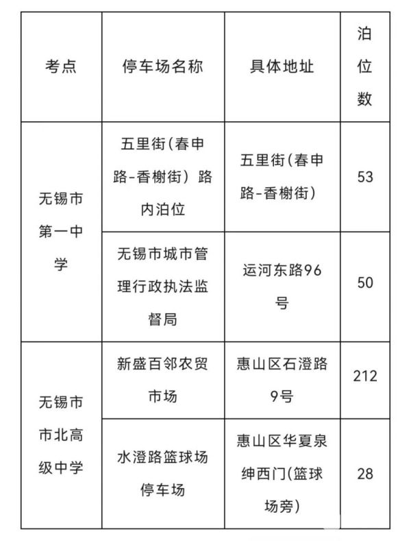 六月,莘莘学子将踏上高考考场,书写人生答卷。每年的高考期间,考点门口都站满了陪考家长、停满了送考车辆。今天(6月5日)记者从无锡了解到,为方便家长们接送考生,无锡市城管系统和交警部门在各考点周边设置了便民停车点、路边临时停放点,以惠民举措助力送考停车无忧,此次总计提供3788个停车泊位。以下是全市便民停车点位,高考期间为广大考生家长提供免费停放服务。