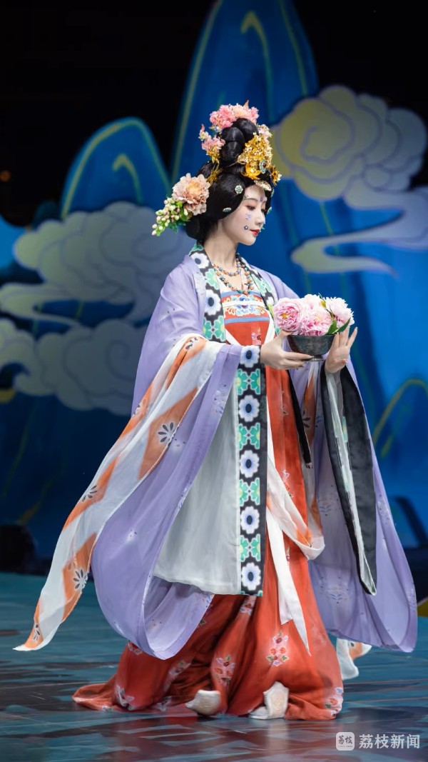 转瞬之间,衣服已经有了颜色——白底印花的上襦,暗红色唐风印花齐胸裙,淡绿色广袖上襦、紫色大袖衫,白底印唐花披帛。妆容精致的女子捧着花盏,低眸回首,转身向后走去。风吹起她的宽袍,牵起历史的涟漪。