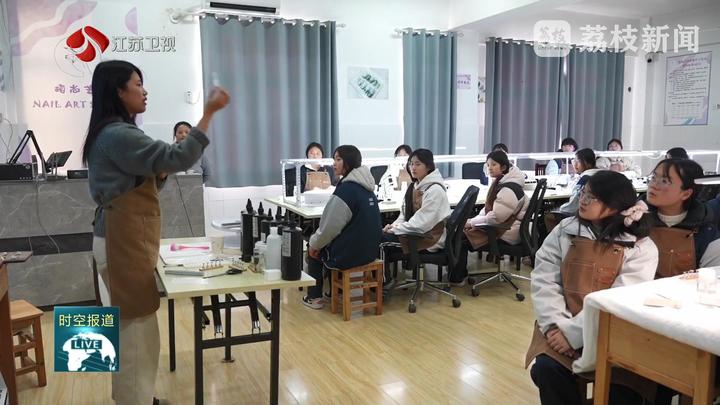 在这个以穿戴甲培训为主题的“家门口”就业服务站,指导老师正手持纱条,边示范边讲解。打磨甲片、调配甲油胶……学员们跟随步骤专注练习。这个技能培训班是当地人社部门依托职业学校开设的,企业出岗位、学校培技能、合格即就业。