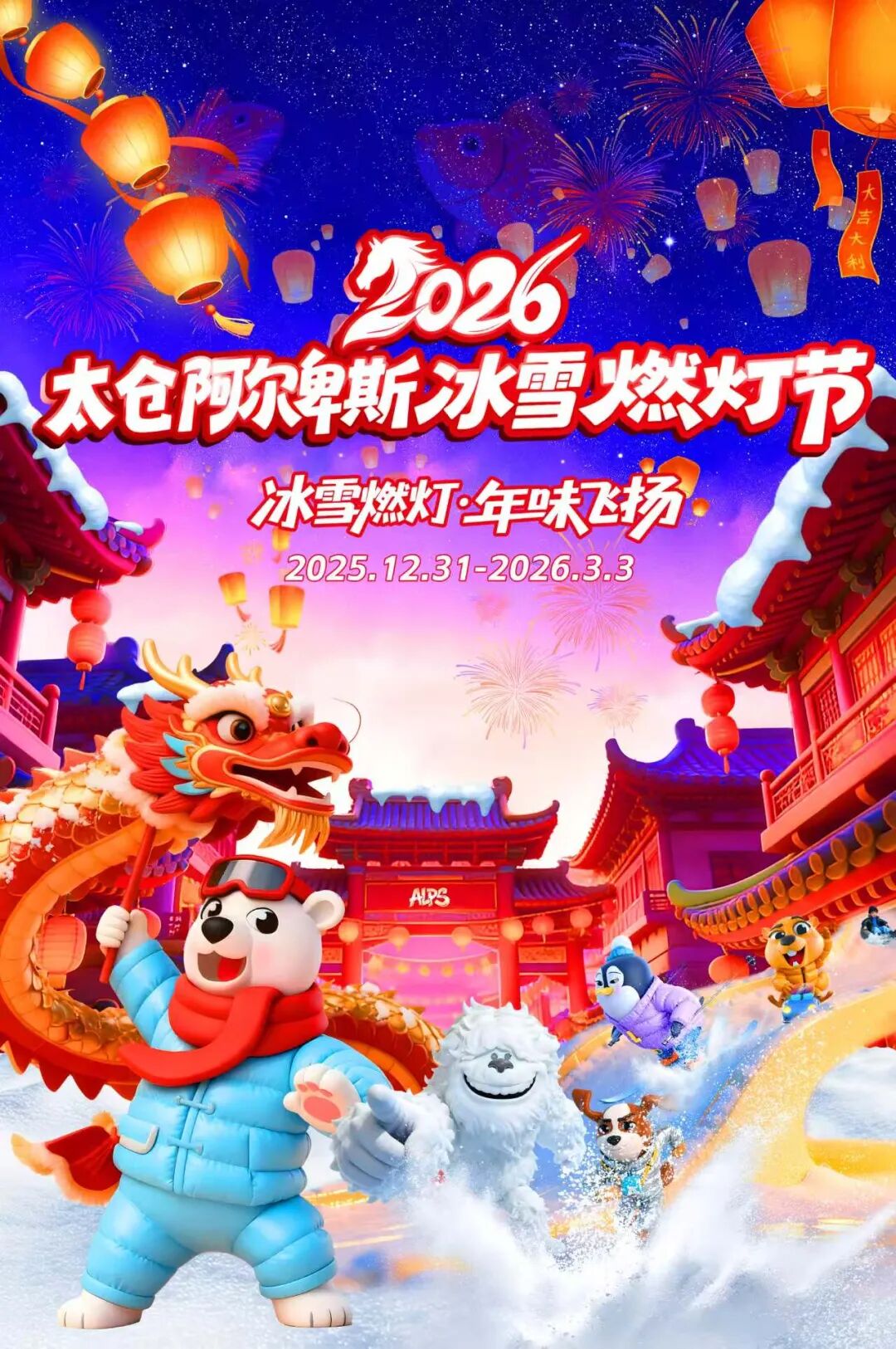 在阿尔卑斯国际度假区内打造长三角首个融合欧洲雪乡美学、冰雪科技造景与中国传统花灯艺术的沉浸式主题夜游项目。活动包含灯光秀、烟火秀、篝火晚会、跨年音乐会及新春巡游等,让游客在梦幻场景中感受浓郁年味。