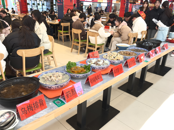 “民间素有‘冬吃萝卜夏吃姜,不劳医生开药方’的谚语。这道羊肉萝卜汤以带骨羊肉、白萝卜为主料,佐以生姜、葱段、白胡椒烹制而成,既能驱寒暖身,更是体虚畏寒、脾胃虚寒人群的秋冬养生佳品……”活动现场,学生讲解员围绕每道药膳的原料配伍、功效作用、文化渊源进行专业解读,让师生在品尝美味的同时,深入了解中医药文化的实践价值。“以前觉得中医药很深奥,离生活很远。”药学院生物制药专业246班董馨瑶同学有感而发,“今天通过品尝有故事、有功效的药膳,才明白‘药食同源’就蕴藏在日常的一粥一饭之间。”