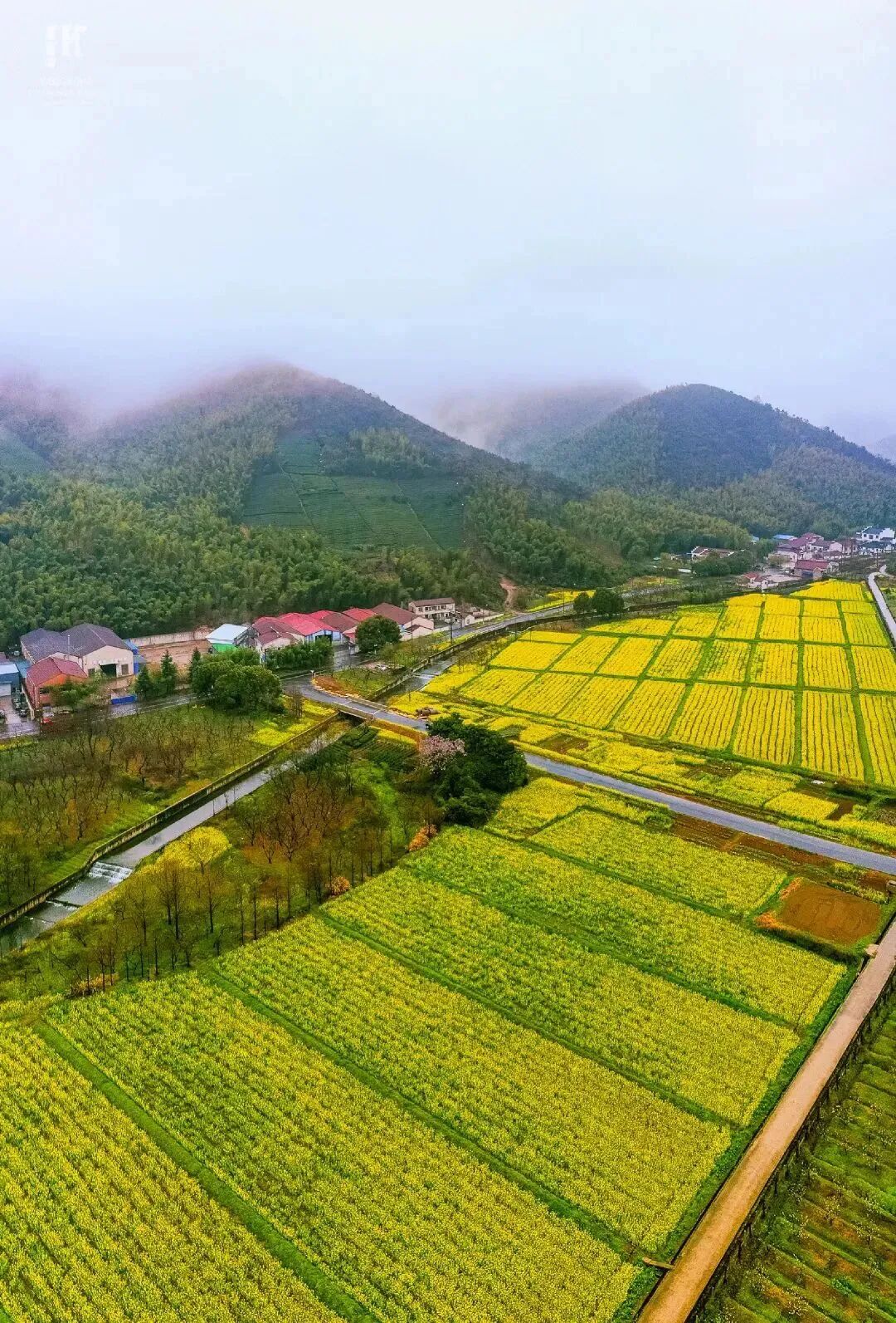 近处田野旁的小屋点缀花海,完美诠释“诗与远方”。