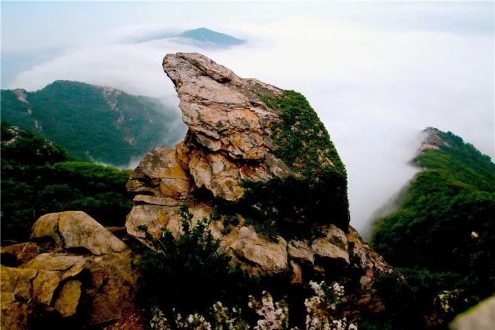 壮丽的玉女峰巅云海被列为云台二十四景,据清代《云台山二十四景·云台铺海》载:“将晓,洞云滚滚而升,若银涛状,久之殿阁皆失。日出则金光闪烁,平铺似海。海上山,山上云,不知是云是海,觉人山云海,飘然欲动,移时始散。”
