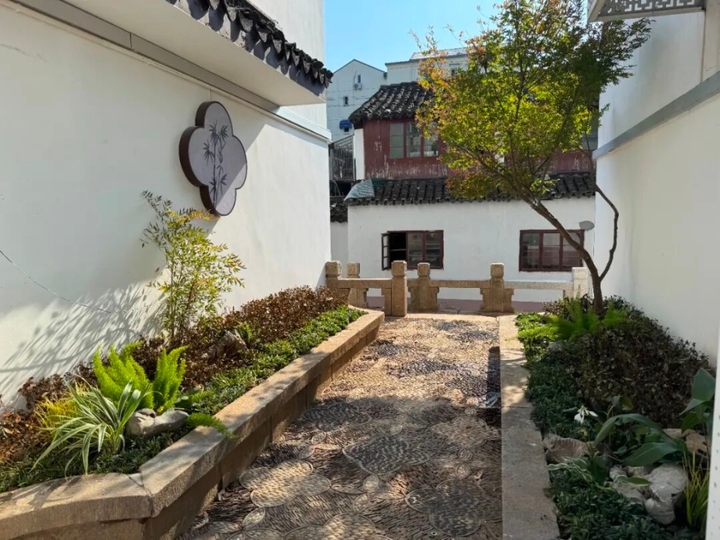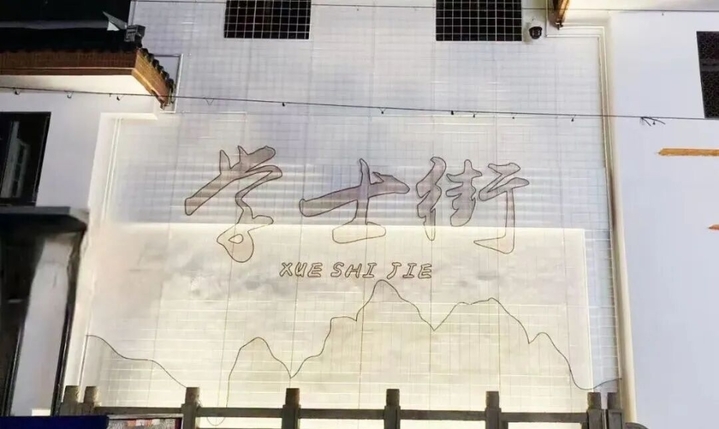 焕新后的学士街姑苏味更浓,新潮范更足。两侧人行道上,“吃茶”“吃酒”“吃水”等“苏州闲话”嵌在地面铺装上,一步一景,引发老苏州的情感共鸣。沿河多处公共空间增加了植被覆盖,增强了景观的自然意趣。南入口处通过设置墙面投影艺术和特色打卡点位,进一步活跃了街巷氛围,提升了公共空间的吸引力和互动性。
