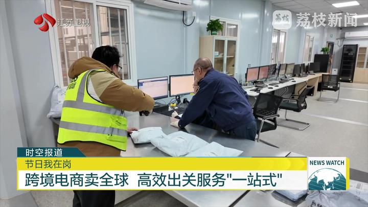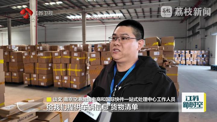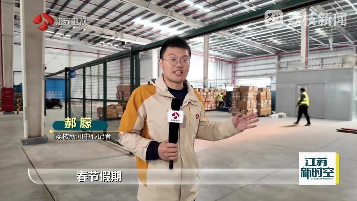 荔枝新闻中心记者郝朦说:“这里是南京空港跨境电商和国际快件一站式处理中心,春节假期,每天这里都有超百吨近万件商品从这里出海。我身后这一批纺织品快消品今晚也将搭乘飞机从这里飞往荷兰、美国等欧美地区。”