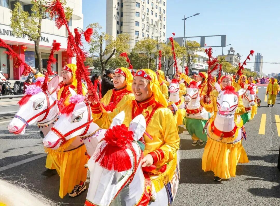 正月初五(2月21日),通州区主城区上演了“骏马迎春 福驰万里”南通州民俗文化大巡游。活动集结了17个特色方阵,涵盖非遗展示、特色花车等板块,集中呈现了通州家纺、建筑产业优势以及乡村振兴成果。龙狮呈祥、花车竞艳的盛况吸引了超5万名市民游客驻足观看,将节日气氛推向高潮。