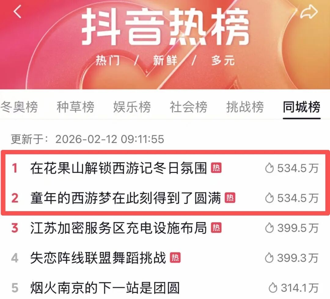 “在花果山解锁西游记冬日氛围”“童年的西游梦在此刻得到了圆满”“来海州古城过电音年”等多个话题持续多日登上抖音同城榜榜首。