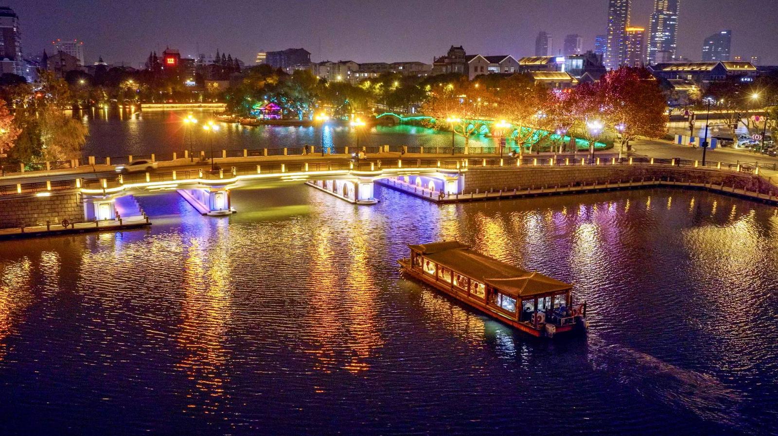 华灯初上,濠河两岸灯光璀璨,波光粼粼的河面与绚丽的灯光交相辉映,勾勒出千年濠河的绝美轮廓。记者25日从南通濠河景区获悉,春节假期初一至初七,“濠河夜画”沉浸式实景演艺项目迎来市民游客7500人次,成为打卡爆款,濠河文旅魅力进一步彰显。