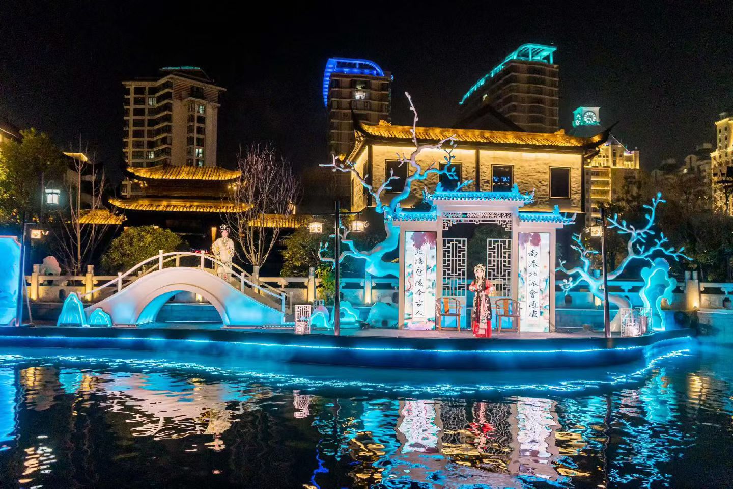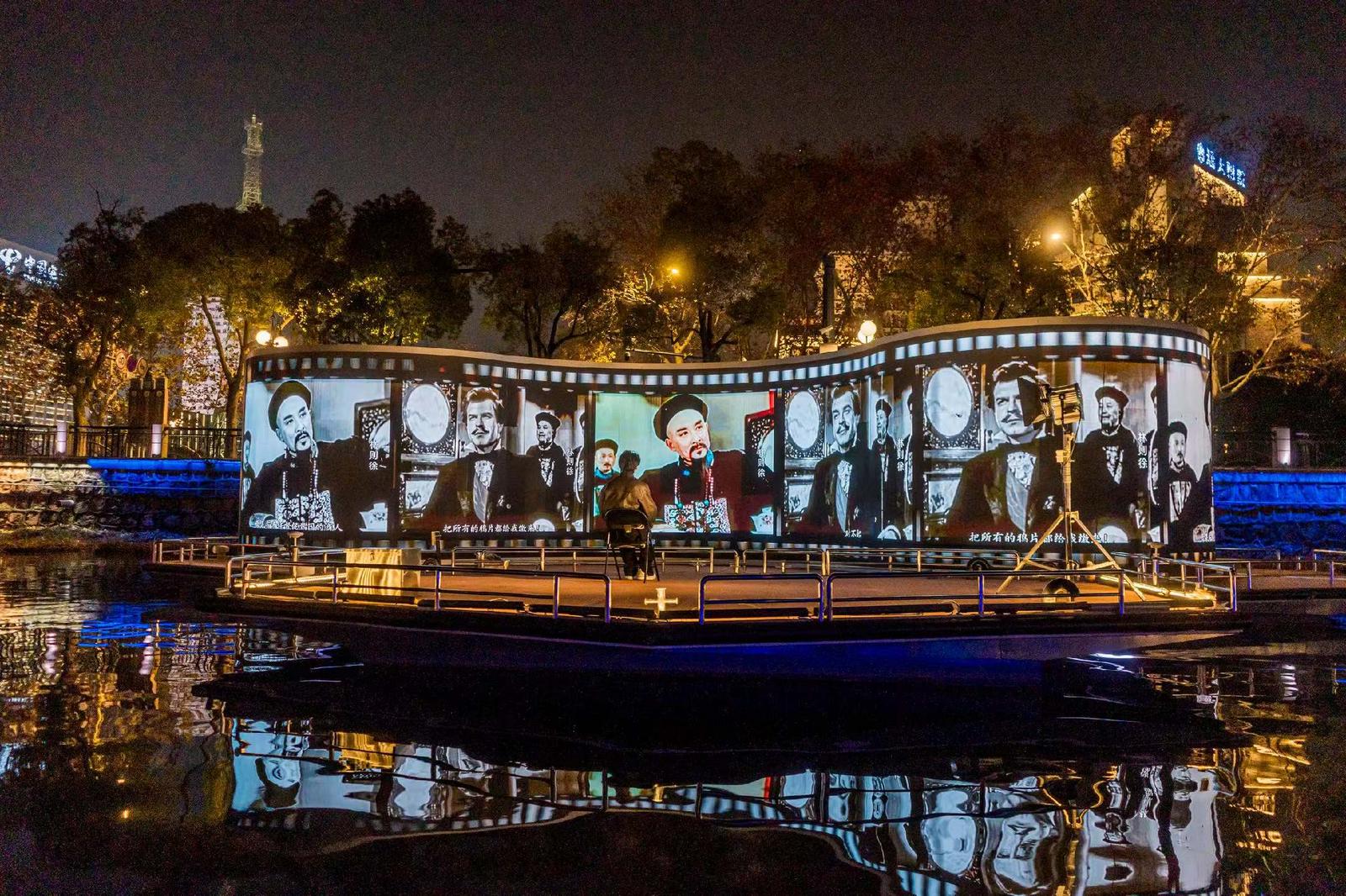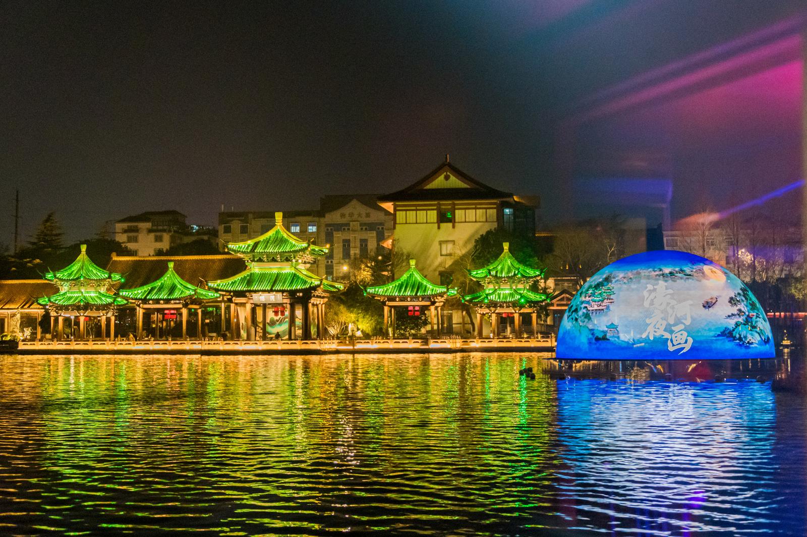 濠河是南通城的护城河,形如葫芦,宛如珠链,被誉为南通城的“翡翠项链”。“濠河夜画”是濠河景区水岸联动更新升级核心项目,以“打造夜游场景、演绎通城故事、联动水岸空间、尽享沉浸体验”为设计理念,沿濠河游船动线,在濠西书苑及盆景园、中公园及南公园、博物苑及群英馆、濠东绿地及城隍庙四个片区,打造了八大篇章、二十处观赏场景,并通过声光电技术和真人实景演艺,构建出了一部“可航行的城市光影剧本”,生动呈现了南通深厚的实业传统、人文积淀与城市愿景。与此同时,景区还对沿线导览标识和夜景照明进行了优化升级,增设互动打卡装置与诗词光影点缀,让游客真正从“匆匆过客”转变为“沉浸体验者”。