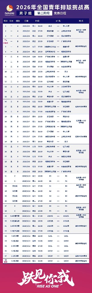 据了解,1月26日至2月4日,男排挑战赛第一阶段在江西省上饶市上饶体育中心举行,男子组第二阶段在启东中学、启东第一中学体育馆举行,男子组第二阶段参赛队伍为2025—2026赛季中国男排超级联赛B级成年队+青年男排挑战赛第一阶段成绩排名前六的队伍。