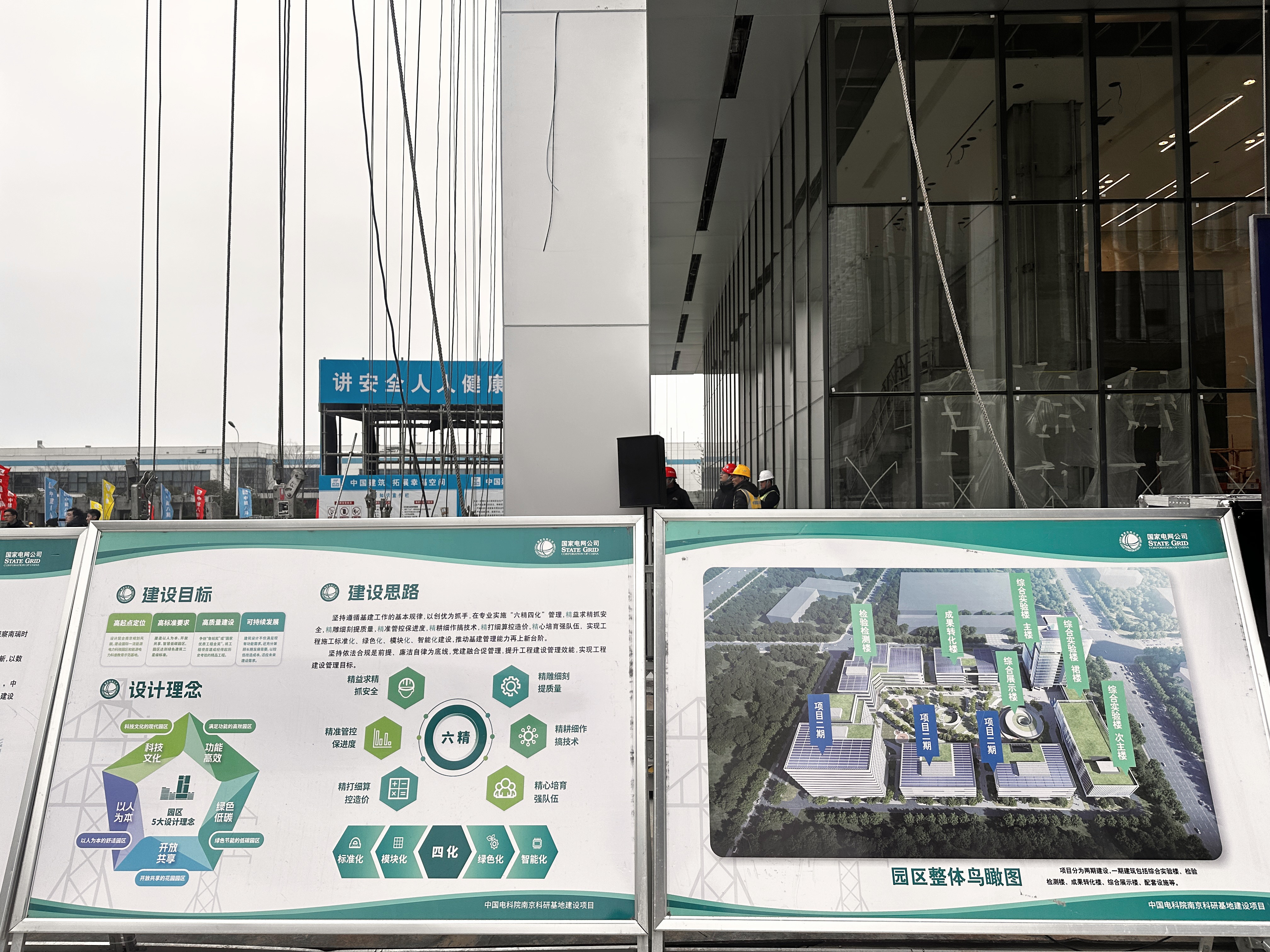 在中国电科院南京科研基地项目建设工地,一面面旗帜迎风招展,多栋现代化建筑主体已初现轮廓。