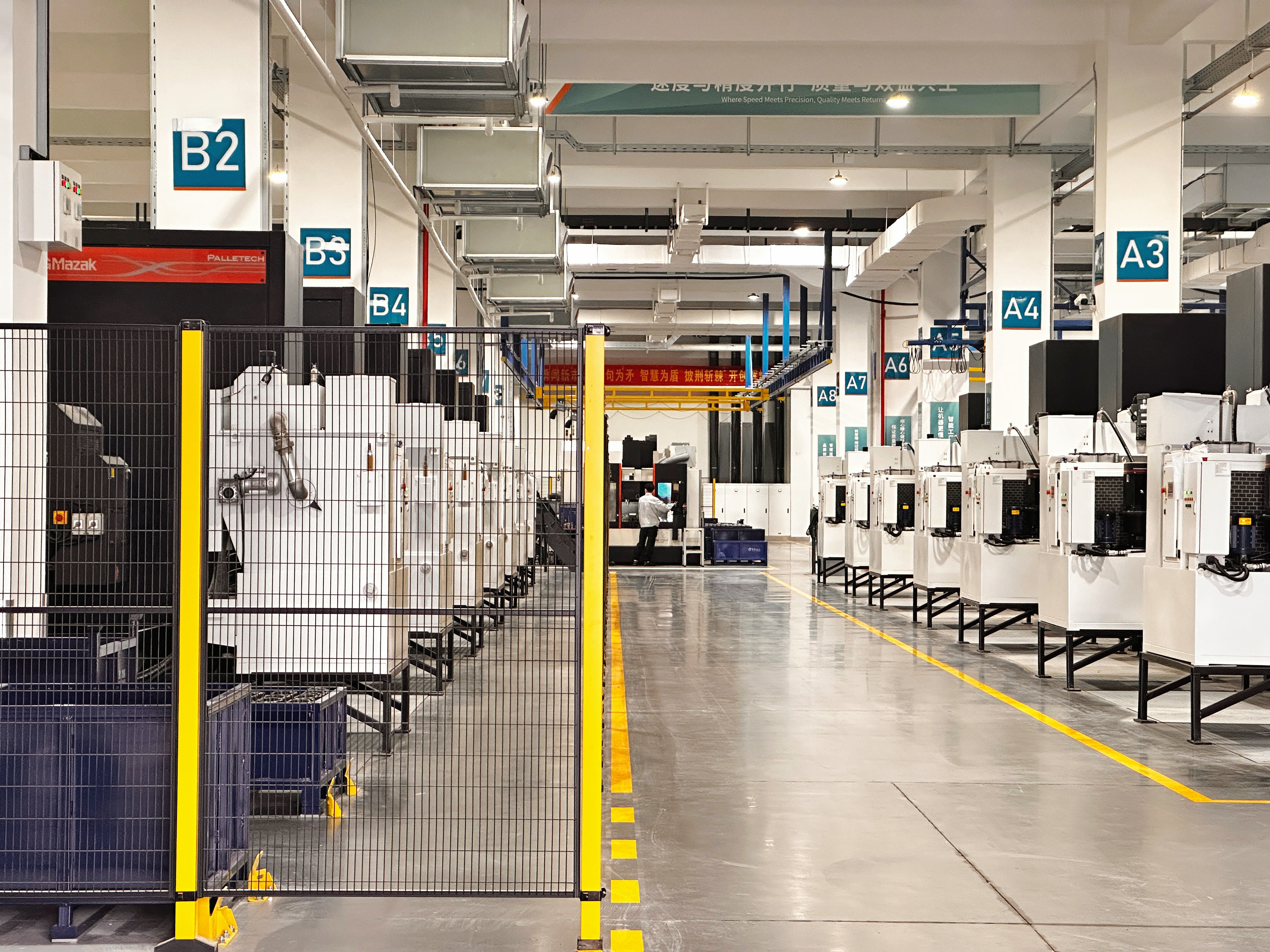 走进一楼的机加工车间大门,光洁的地面上,一道道醒目的黄色标识线蜿蜒延伸,勾勒出AGV(自动导引车)的专属“航道”。这些无人驾驶的小车将载着毛坯件,精准停靠在指定工位。