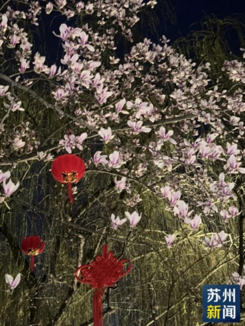 漫步在金鸡湖畔,一树玉兰静静绽放,花朵与红灯笼相映成趣。